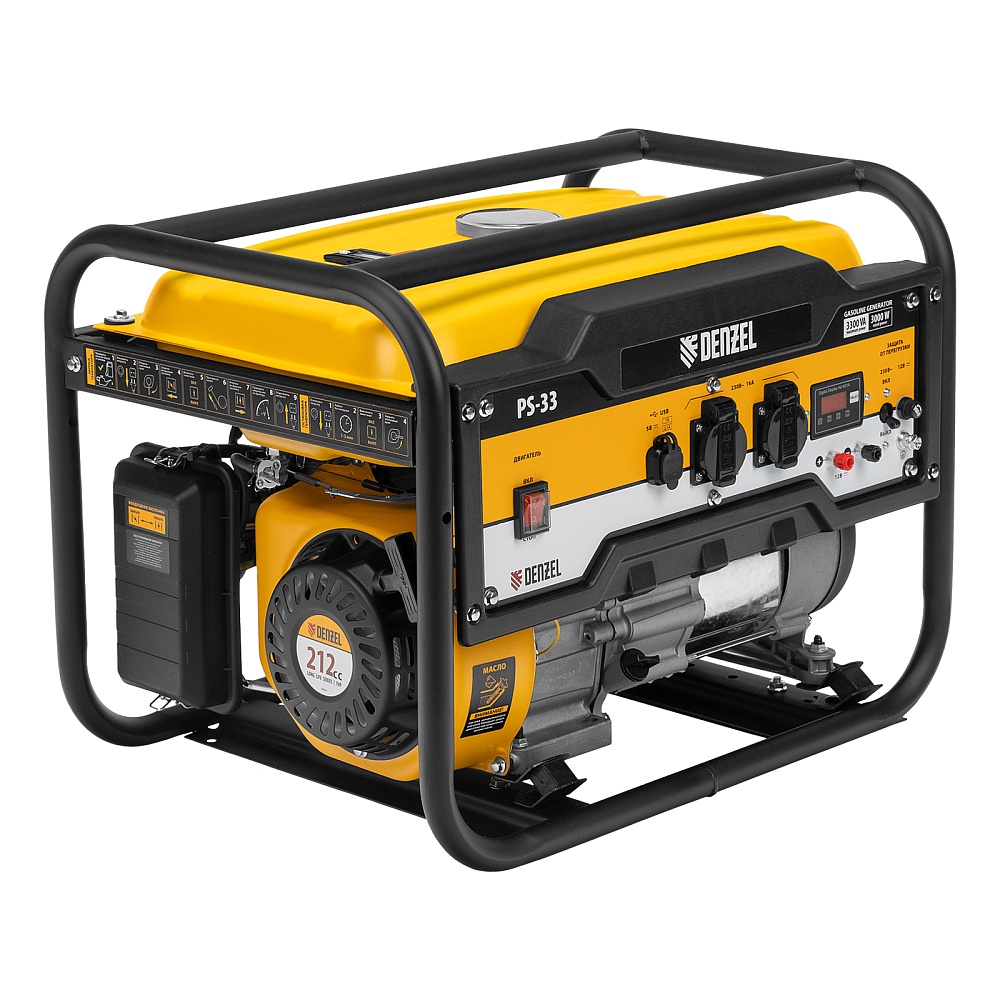 <p>Генератор бензиновый Denzel PS 33 946834 максимальной мощностью 3,3 кВт при параметрах сети 230 В, оснащен ручным стартером и увеличенным бензобаком на 15 л. Предназначен для автономного электроснабжения однофазным током маломощного оборудования. Это экономичная и простая в использовании модель, оптимально подходящая для дачного участка, домашней мастерской, кемпинга и рыбалки, а также строительной площадки. </p><p>Генератор станет отличным помощником в условиях отсутствия электричества. Например, можно одновременно подключить 5 ламп дневного освещения, ноутбук, холодильник, телевизор и электрочайник.</p><h2>Преимущества</h2><ul><li>Комфортная эксплуатация — надежный четырехтактный двигатель с верхним расположением клапанов (OHV) экономично расходует топливо и имеет небольшой уровень шума 85 дБ.</li><li>Безопасность — защита от работы при низком уровне масла, от перегрузки и короткого замыкания значительно продлевает срок службы генератора.</li><li>Долгое функционирование — благодаря увеличенному бензобаку генератор способен работать более 12 часов без дозаправки.</li><li>Простая навигация — все элементы управления вынесены на переднюю панель и интуитивно понятны.</li><li>Удобный контроль параметров работы — производитель предусмотрел вольтметр и индикатор уровня топлива.</li><li>Возможность подключения чувствительной техники — блок AVR обеспечивает работу без скачков напряжения.</li><li>Надежность — увеличенный диаметр провода обмотки статора, медная обмотка альтернатора и металлический распределительный вал улучшают качество работы.</li><li>Легкое перемещение — генератор отличается небольшими габаритами 60×44×46 см.</li><li>Гарантия 3 года — высокое качество генератора подтверждено производителем.</li></ul>
