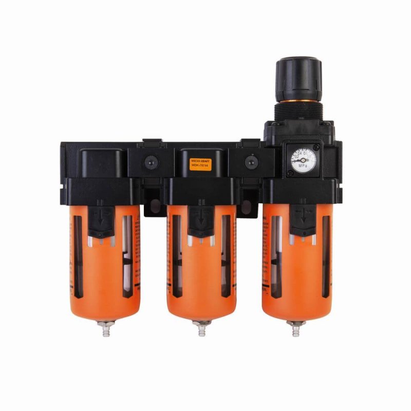Модульная группа с тремя влаго-маслоотделителями и регулятором давления. Обеспечивает трехступенчатую фильтрацию и сепарирование сжатого воздуха, используя фильтрующие элементы различной степени очистки.
