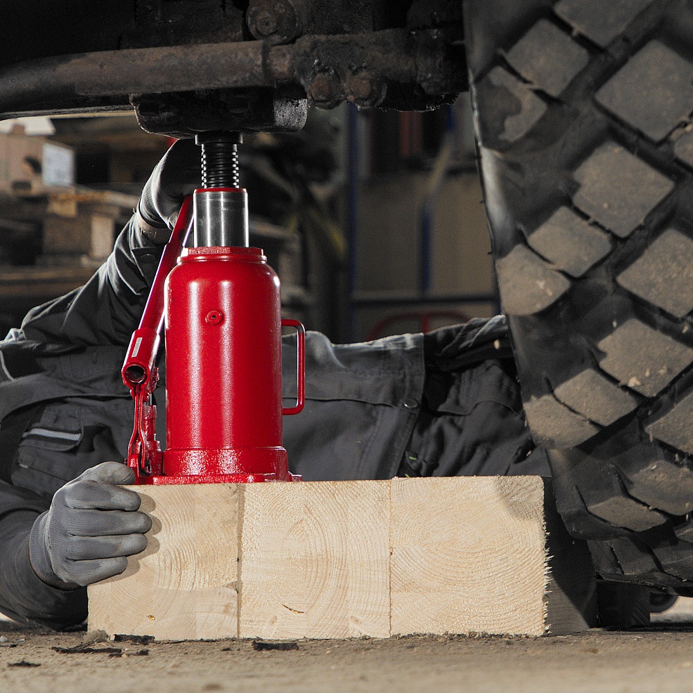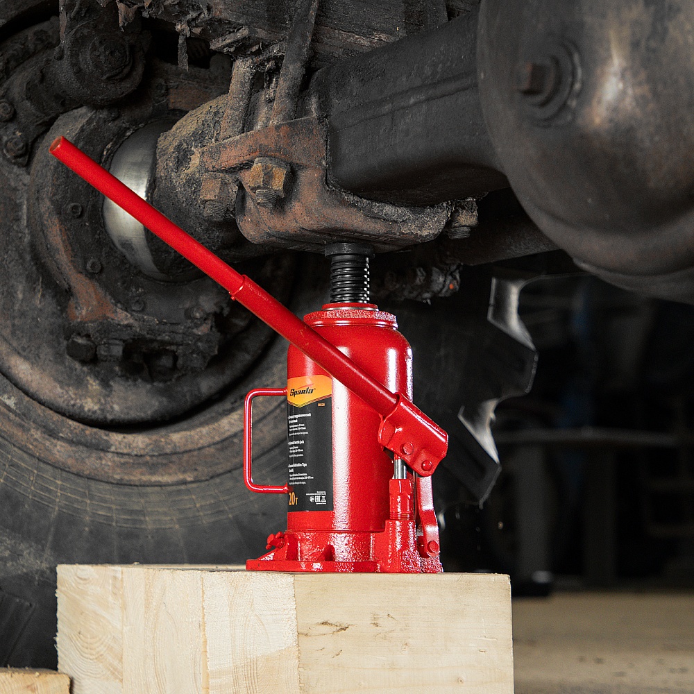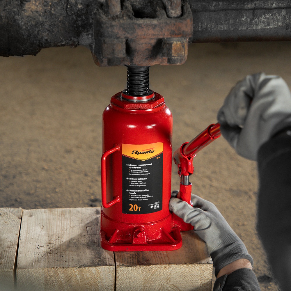 Гидравлический бутылочный домкрат Sparta 50328 рассчитан на подъем грузов весом до 20 т на высоту от 250 до 470 мм. Он пригодится как автолюбителям в гараже, так и профессиональным мастерам в автосервисах. Домкрат обеспечивает плавный подъем груза без особых усилий со стороны пользователя.