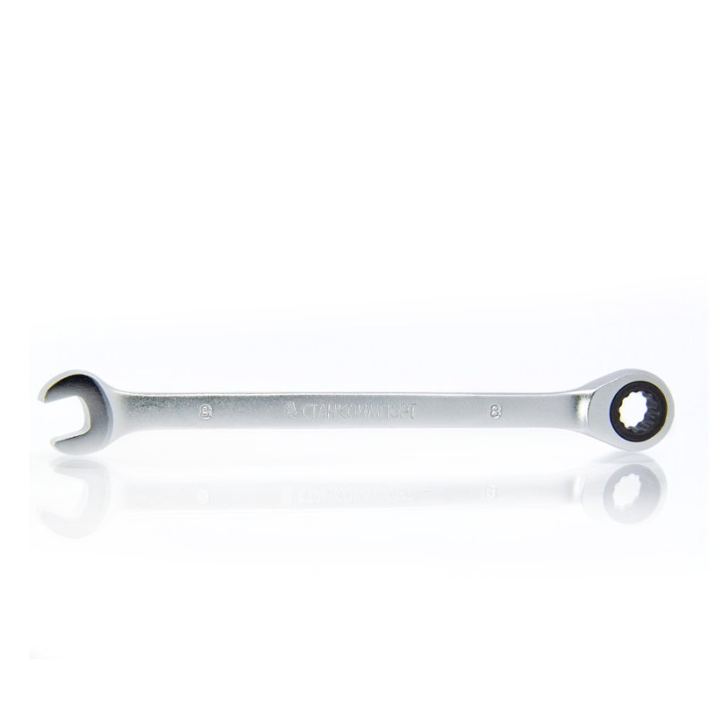 Комбинированный гаечный ключ представляет собой конструкцию, объединяющую рожковый и накидной профиль. Накидной профиль ключа имеет 72 зубый трещоточный механизм. Благодаря применению хромванадиевой стали марки 6140 и правильно проведенной закалке, механизм обеспечивает высокий крутящий момент. Малый (5°) обратный ход делает ключ незаменимым при работе в ограниченном рабочем пространстве. Ключ изготовлен по стандарту DIN, имеет трехслойное хромоникелевое покрытие, обеспечивающее повышенную стойкость к коррозии. Применяется при проведении широкого спектра слесарных работ.
