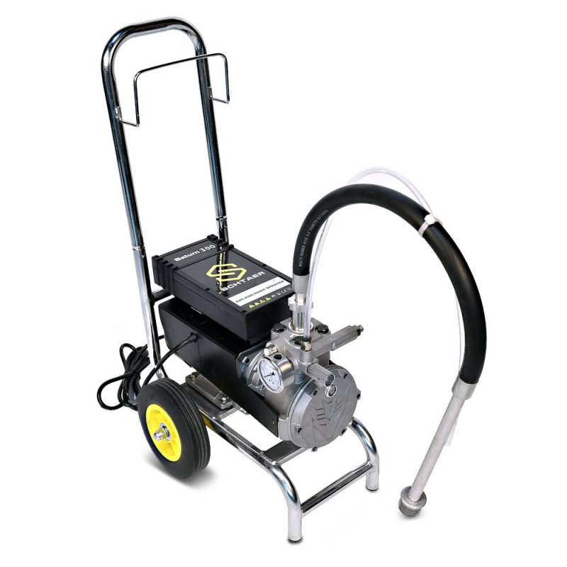 Schtaer Saturn 300 – безвоздушный окрасочный аппарат с мембранным насосом для распыления ЛКМ средней и низкой вязкости. Агрегат используется на строительных площадках, применяется для покраски стен, потолков, фасадов водными, акриловыми и фасадными красками. Окрасочный аппарат также можно применять для окраски металла масляными красками. Вязкость распыляемых красок должна не превышать вязкость 3 % кефира. После окраски агрегат должен промываться теми же растворителями, которыми разбавляется краска. Максимальная длина шлангов от окрасочного аппарата 30-45 метров.