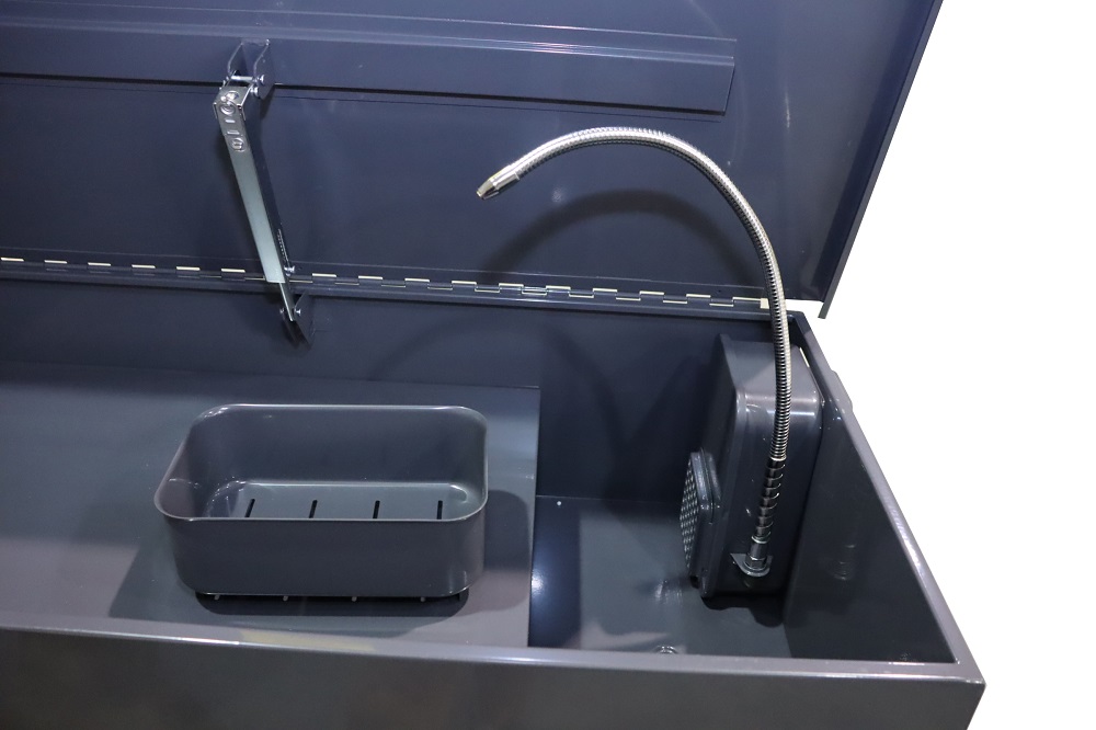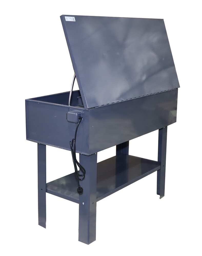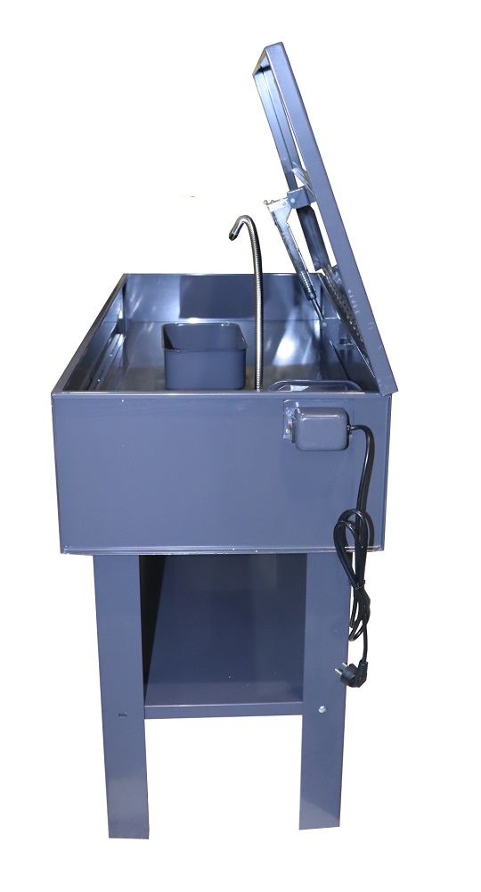 Промывочная ванна WDK-82150 оснащена электрическим насосом для подачи очищающего раствора и резервуаром большой ёмкости. Отличается повышенной мощностью напора жидкости для очистки. Позволяет загружать одновременно большое количество деталей. Размещается на разборном стенде с ножками и полкой (в комплекте).