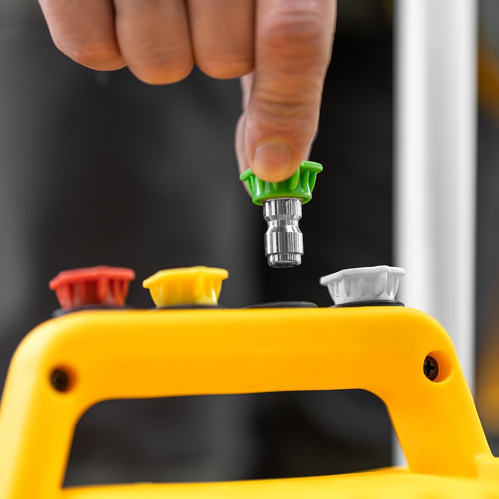 Мойка высокого давления, Шланг высокого давления, Пистолет моечный, Насадка-удлинитель, Форсунки 4 шт., Пеногенератор с бачком для моющего средства, Входной штуцер с фильтром, быстросъемный коннектор шланга, Игла для прочистки сопла, Инструкция по эксплуатации с гарантийным талоном