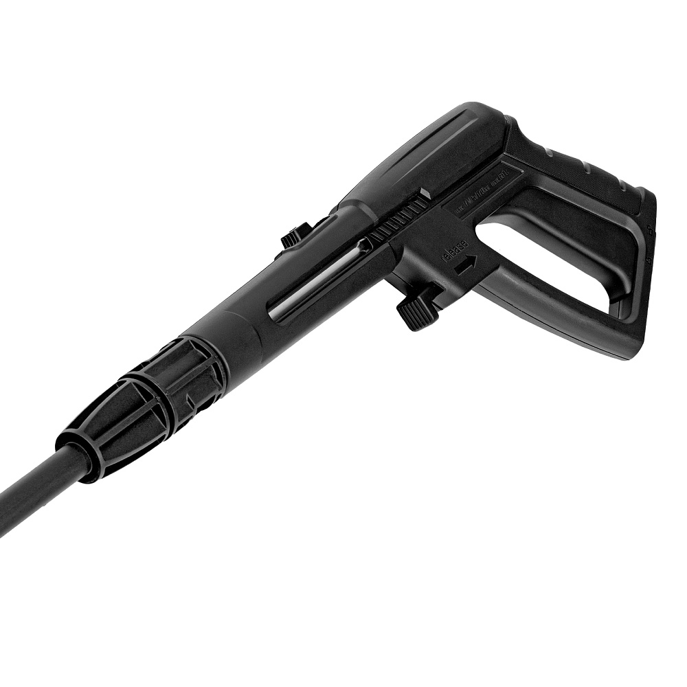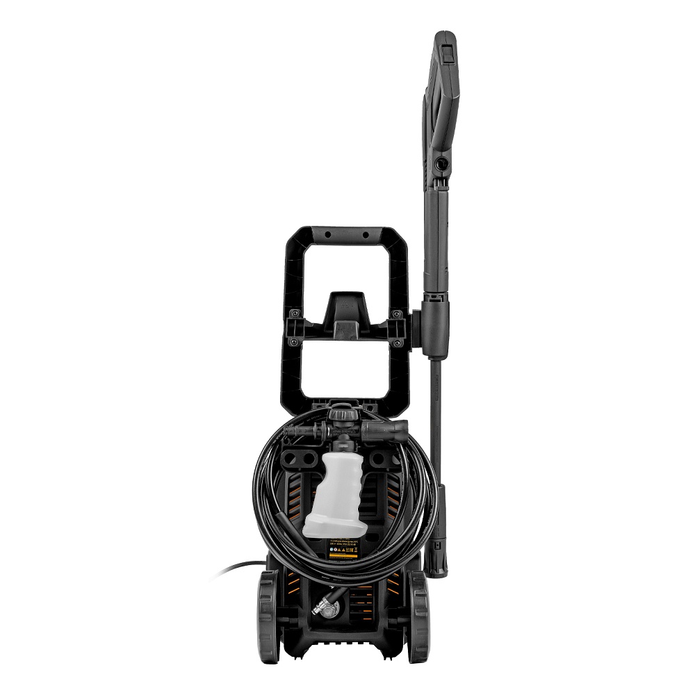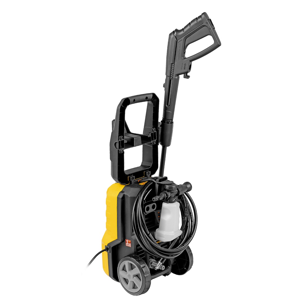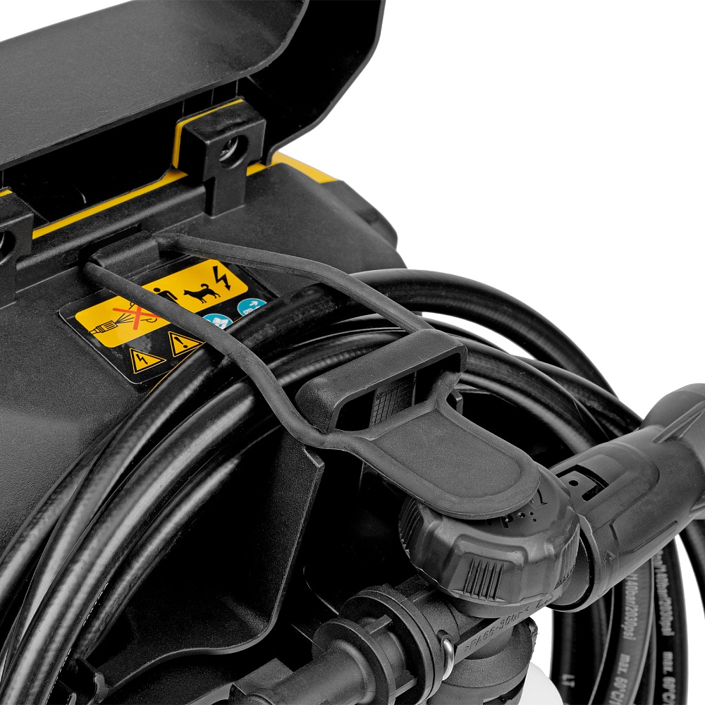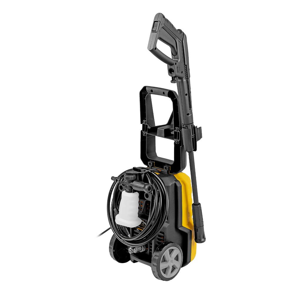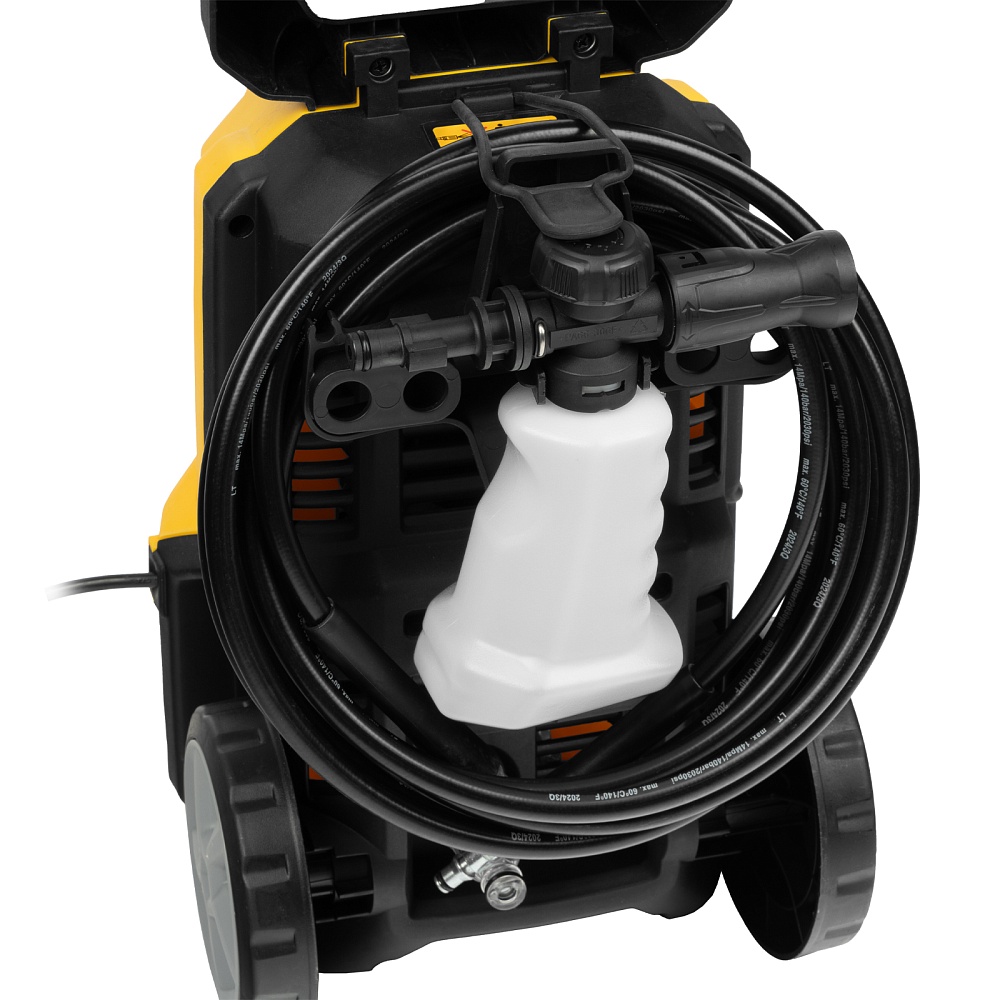 Мойка высокого давления, Кронштейн для шланга, Шланг высокого давления, Пистолет, Удлинитель пистолета с регулируемым соплом, Пеногенератор с бачком для моющего средства, Входной штуцер с фильтром, Быстросъемный коннектор шланга, кронштейн-держатель пистолета, Кронштей сетевого кабеля, Игла для прочистки сопла, Комплект крепежа, Инструкция с гарантийным талоном
