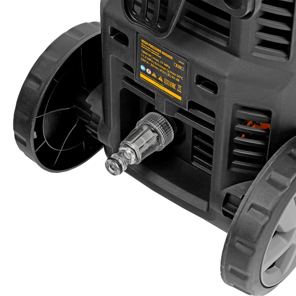 <p>Моечная машина высокого давления Denzel R-170 58262 мощностью 1800 Вт поддерживает максимальное рабочее давление до 170 бар и обеспечивает объем подачи воды 380 л/ч. Позволяет быстро и эффективно очистить садовый инвентарь, фасад дома, дорожку, отмыть автомобиль и т.д. Оснащена самовсасывающим помпой, поэтому может работать даже без подключения к водопроводу — подойдет любой резервуар или емкость с водой. Машина оптимальна для бытового использования.</p><h2>Преимущества</h2><ul><li>Долговечность — надежная алюминиевая помпа со стальными плунжерами выдерживает высокие нагрузки и обеспечивает стабильное давление в течение всего срока службы машины.</li><li>Эффективное очищение — для получения качественного результата можно использовать моющее средство (внешний пеногенератор с функцией улучшенного пенообразования входит в комплект поставки).</li><li>Простая подготовка к работе — быстросъемный адаптер облегчает подключение шланга подачи воды.</li><li>Защита от засорения — фильтр входного штуцера задерживает посторонние частицы, продлевая срок службы помпы.</li><li>Продуманная комплектация — машина поставляется с иглой для прочистки сопла, что упрощает уход за техникой.</li><li>Класс защиты II — токопроводящие элементы надежно изолированы для защиты пользователя от получения электротравмы.</li><li>Безопасность — перед началом работы необходимо разблокировать рычаг моечного пистолета для предотвращения случайного запуска.</li><li>Защита от превышения максимально допустимого давления — машина оснащена перепускным клапаном, манометрический выключатель останавливает насос при отпущенном рычаге пистолета.</li><li>Термозащита — производитель предусмотрел датчик температуры и автоматическое отключение двигателя при перегреве.</li><li>Комфортная работа — конструкцией предусмотрена эргономичная рукоятка с защитой от случайного пуска</li></ul><p> длина кабеля и шланга высокого давления составляет 5 м, что позволяет свободно передвигаться по участку.</p><p>Мобильность — благодаря транспортировочной рукоятке и колесам моечную машину удобно перемещать.|Гарантия 3 года — высокое качество техники подтверждено производителем.</p>