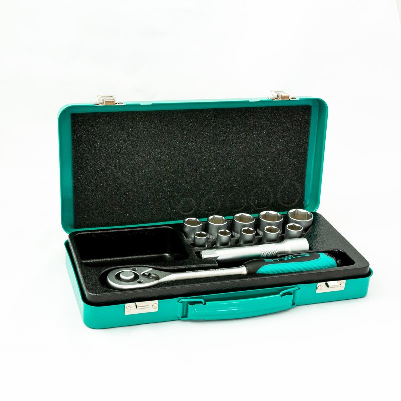 Набор торцевых головок 10-24 мм с трещоточным ключом Stels 13577, с присоединительным размером 1/2 дюйма, включает в себя 12 предметов. Он станет незаменимым помощником для специалистов СТО и автолюбителей, пригодится в гараже, поездке, а также дома и на даче.ПреимуществаУдобная работа в труднодоступных местах — трещотка с 72 зубьями позволяет вращать крепеж плавно и мягко.Прочность — инструменты выполнены из термически обработанной инструментальной стали.Встроенный механизм сброса — снятие и установка насадки занимает несколько секунд.Металлические фиксаторы — насадки крепко держатся и не слетают во время работы.Комфортная работа — эргономичная двухкомпонентная рукоятка не выскальзывает из ладони.Удобное хранение и транспортировка — набор поставляется в надежном металлическом кейсе с ложементом.Высокое качество — инструменты изготовлены под строгим технологическим контролем, на торцевые головки размером от 8 мм распространяется пожизненная гарантия производителя.