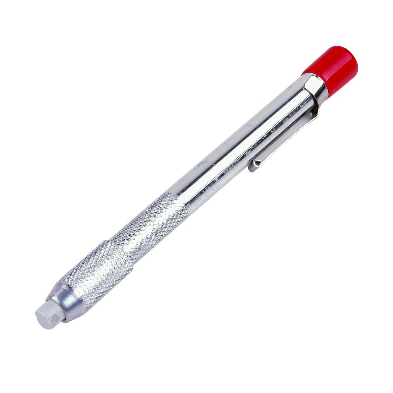 Прочная металлическая конструкция надежно фиксируют и защищает тальковый мелок сварщика от разломов при использовании или при случайном падении. Крепежная клипса позволяет регулировать вылет мелка до нужной длины. Подходит для мелков круглого типа с размерами 127мм x d 6.4 мм.