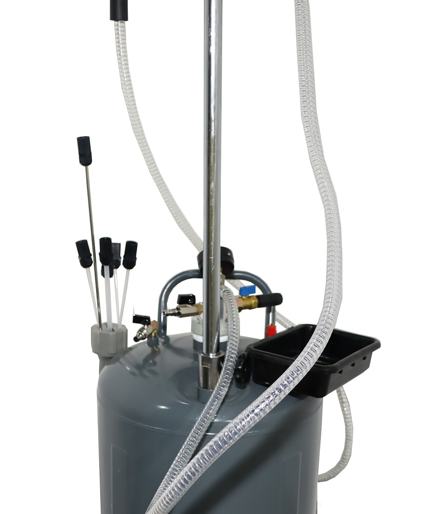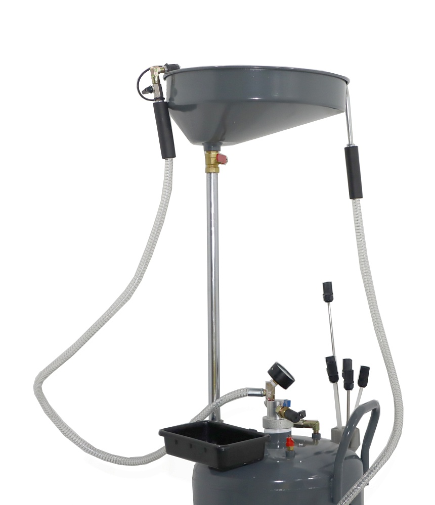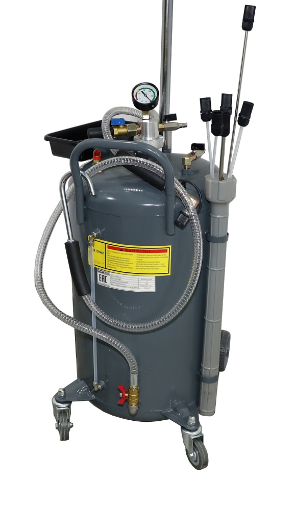 Установка KRAFTWELL, модель KRW1832.80L предназначена для сбора масла, антифриза и других технических жидкостей методом слива самотеком, а также откачкой через щупы. Высота приемной ванны регулируется позволяя точно подобрать удобное положение при работе, а также защитить от разбрызгивания масла.  У основания приемной ванны расположен шаровый кран, перекрывающий слив жидкости в основную емкость до контроля ее состояния. Процедура откачки технических жидкостей через щупы основана на принципе вакуумирования, при котором создается разряжение и жидкость засасывается в емкость, и используется в тех случаях, когда слив невозможен. В комплекте с установкой поставляется набор из 6 щупов различной длины и материала. Индикатор уровня, расположенный на емкости, показывает ее наполненность и вовремя сигнализирует о необходимости опустошения. Для слива жидкости из установки необходимо подключить сжатый воздух к штуцеру, расположенному в верхней части емкости. Под давлением вся жидкость выливается через гибкий шланг с жестким наконечником в емкость большего объема и затем утилизируется. Давление воздуха контролируется по манометру. Для безопасности на корпусе установлен клапан избыточного давления, который предохраняет стенки от деформации и разрушения.