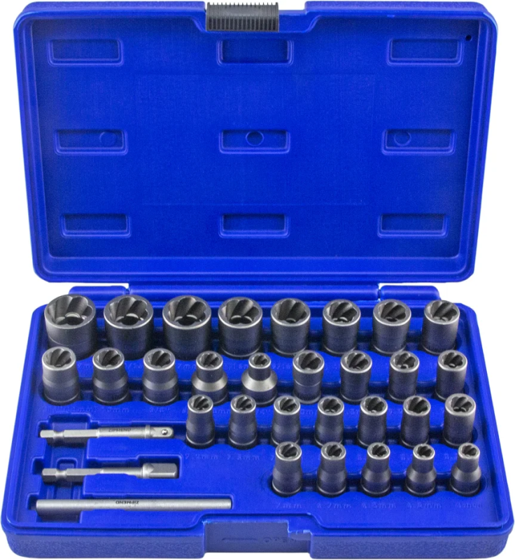 - Набор головок экстракторов ZS-H043001 применяется для откручивания поврежденных, закругленных или ржавых болтов, гаек и винтов.