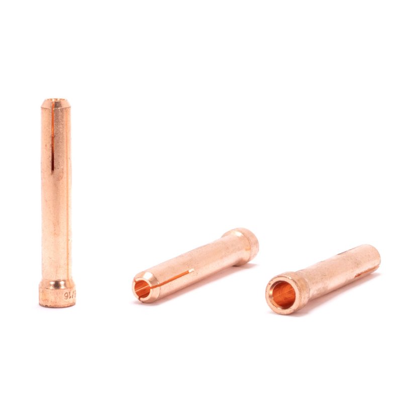 Цанга выполнена из меди и вставляется в держатель цанги. Служит для плотной фиксации вольфрамового электрода в горелке TIG. Диаметр цанги 1,6 мм, и он должен совпадать с диаметром вольфрамового электрода, а также с диаметром держателя цанги. Цанга совместима с горелками TIG TP 9/20/25.