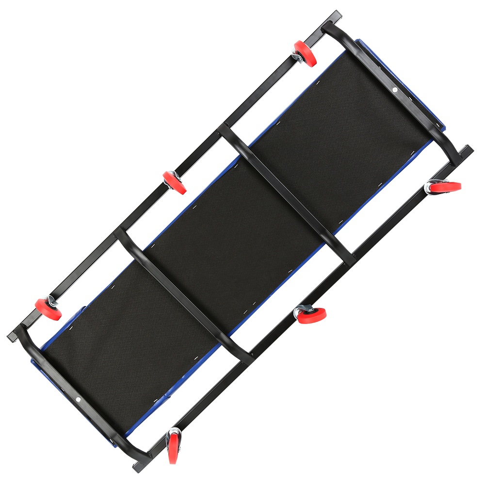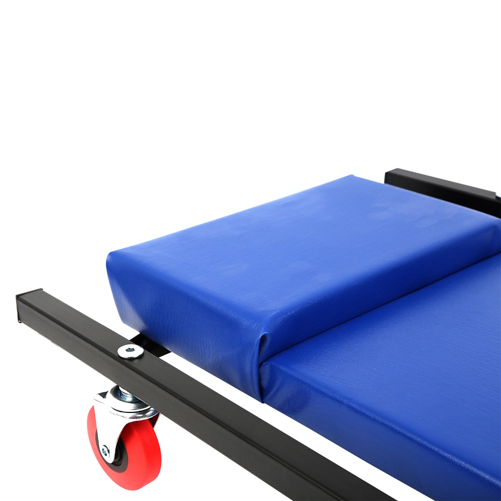 Состоит из металлической рамы с колесами и собственно лежака с поролоном в обивке из дермантина.
