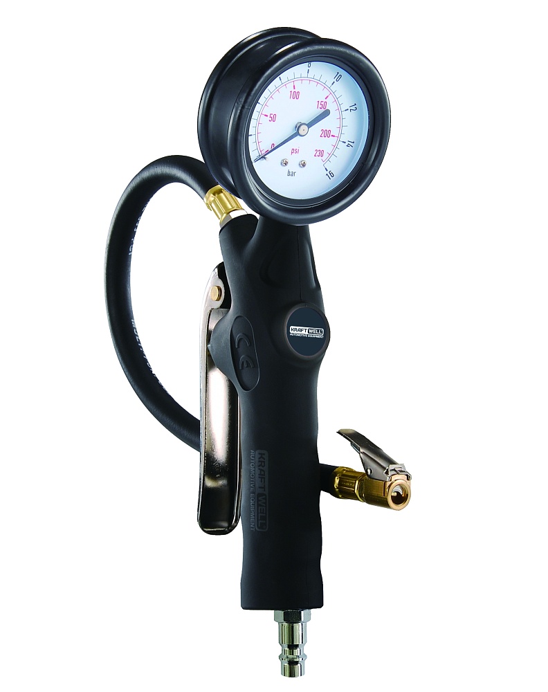 KRWTG-A1 KraftWell Пистолет для подкачки шин. В цветной коробке. Аналоговый манометр. Пластиковая рукоятка, металлический курок. Давление до 16 бар.