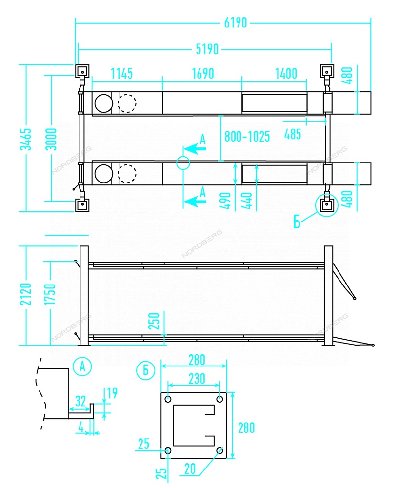 Подъемник четырехстоечный 5 т, без траверсы, для сход-развала, механическое снятие, серый NORDBERG 4450_MG купить в Воронеже цена ✅ - Все для СТО