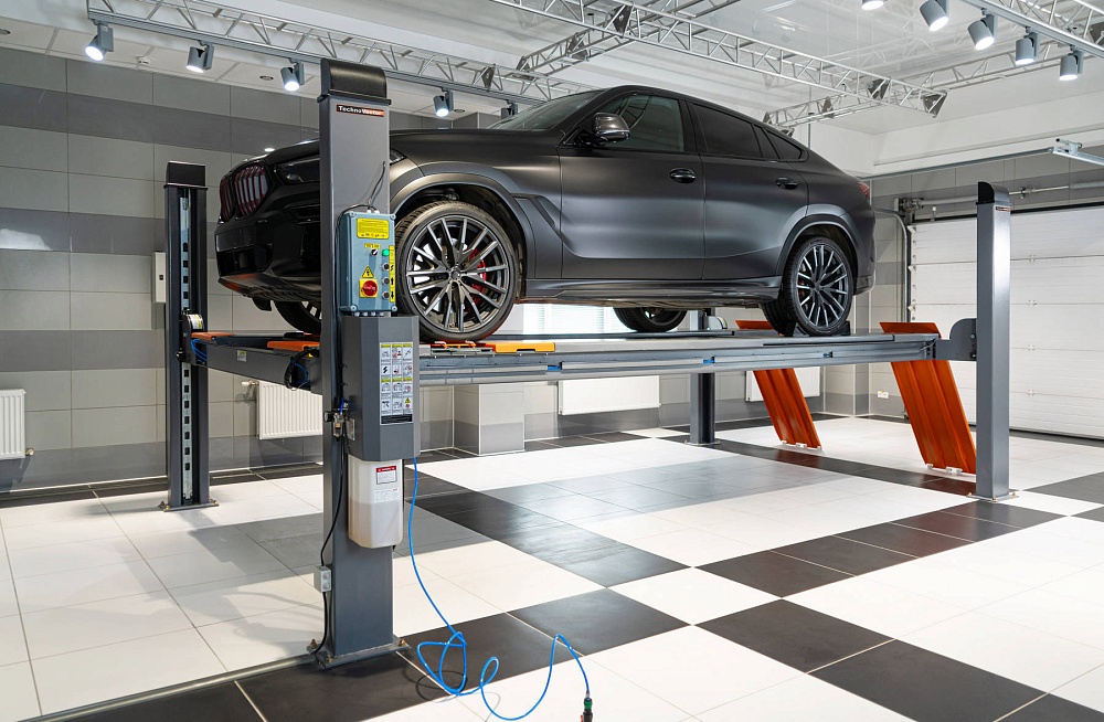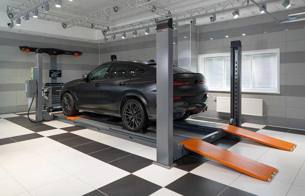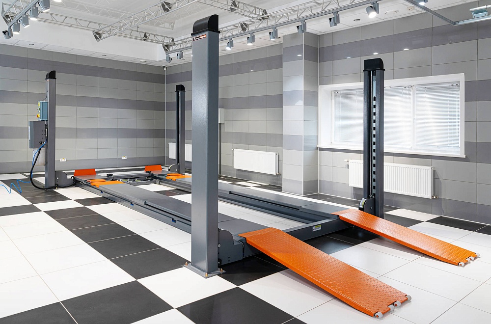 Подъёмник позволяет проводить диагностику, обслуживание и ремонт легковых автомобилей и небольших грузовиков, в частности, проводить работы по измерению и регулировке углов установки колёс.