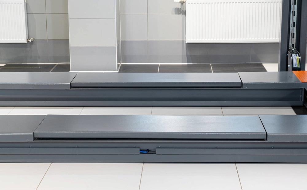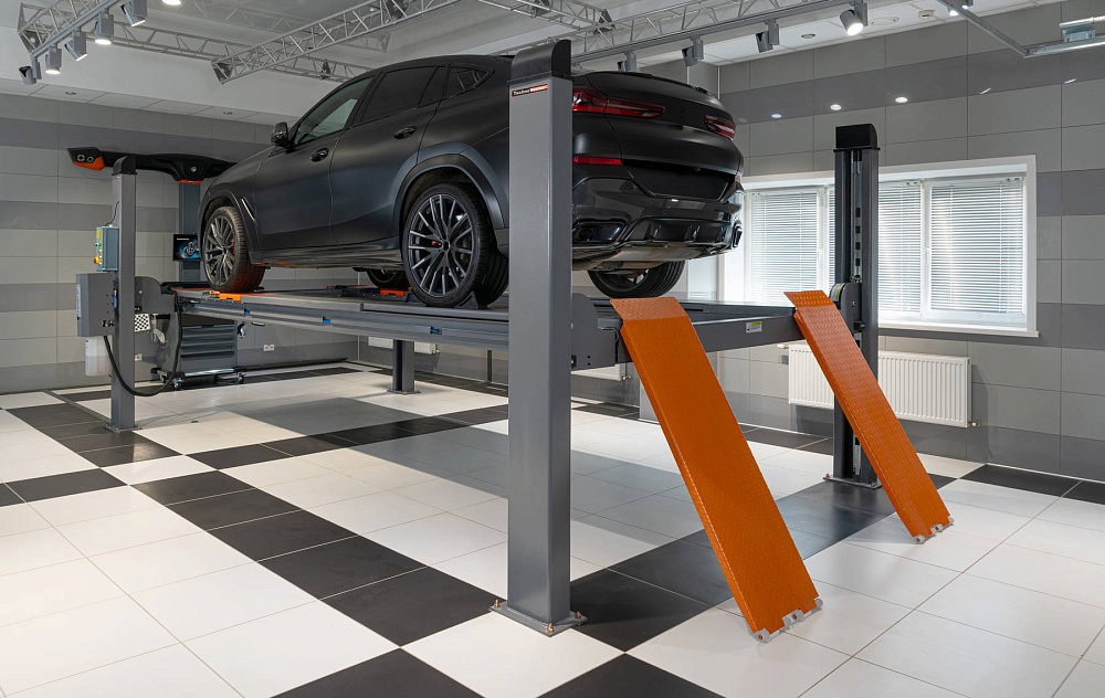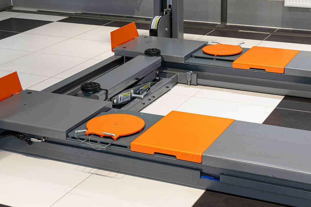 Электрогидравлический подъемник с комплектом для "развал-схождения" для обслуживания легковых автомобилей и легких грузовиков.