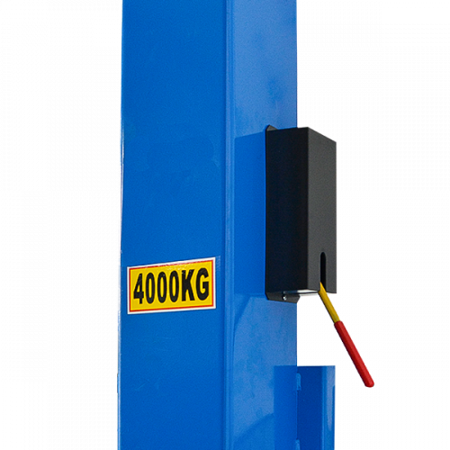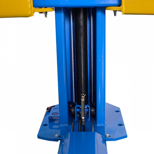 Двухстоечный электрогидравлический подъемник с нижней синхронизацией, грузоподъемность 4 т, механическое управление стопорами на одной колонне.