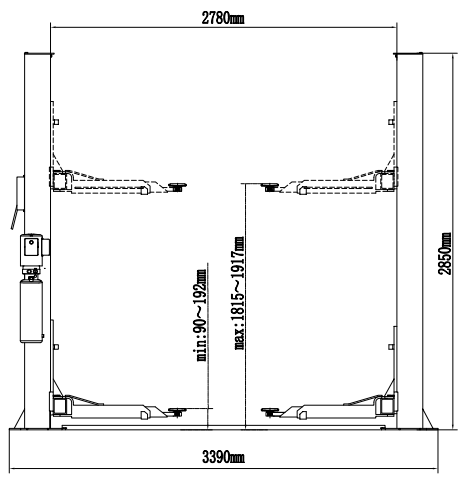Подъемник двухстоечный электрогидравлический, симметричный, двухцилиндровый, г/п 4000 кг., 2,2 кВт, высота подъема 1910 мм., расстояние между стойками 2900 мм., габаритная высота 3692 мм., без основания, с верхней синхронизацией стальным тросом.
