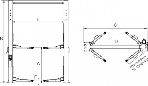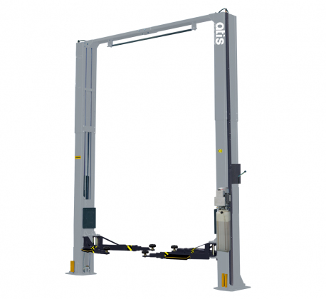 Двухстоечный электрогидравлический подъемник асимметричной конструкции с нижним типом синхронизации. Снятие с замков безопасности электрическое, кнопкой с пульта.