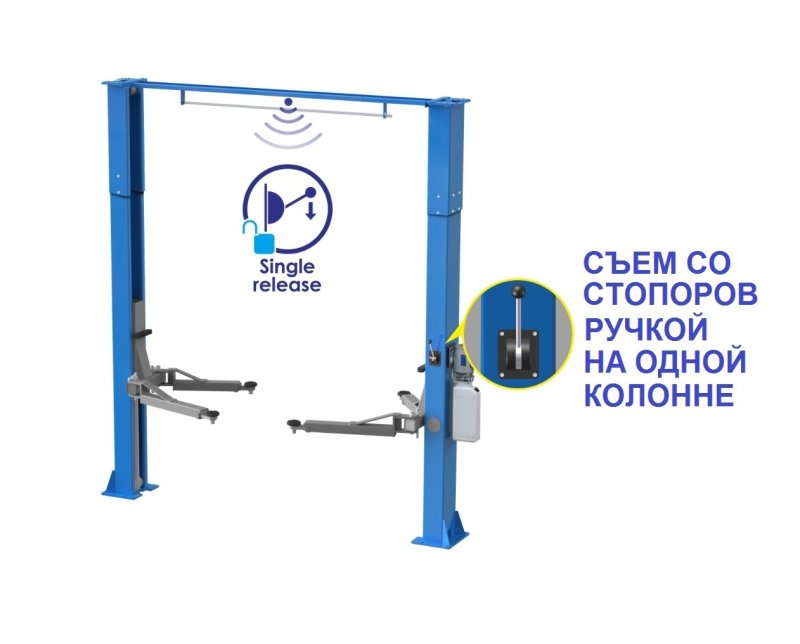 Электрогидравлический 2-х стоечный автомобильный подъёмник с нижней синхронизацией и разблокировкой на двух каретках. Грузоподъемность 4 тонны.