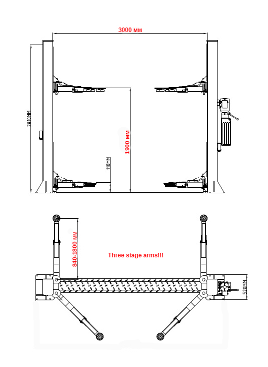 Подъемник двухстоечный электрогидравлический, асимметричный, двухцилиндровый, г/п 5500 кг., 2,2 кВт, высота подъема 1900 мм., расстояние между стойками 3000 мм., с нижней синхронизацией.