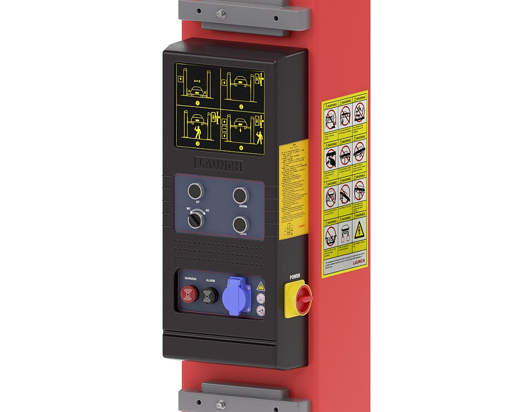 Двухстоечные подъемники Launch в модификациях SBA имеют удобный пульт управления, оборудованный розеткой 220В (класс защиты IP54). Имеет два режима работы (ручной и автома-тический) и аварийную индикацию. Автоматизированная система управления стопорами позволяет работать с подъемником простым нажатием кнопок Вверх / Вниз, без необходимости ручной дезактивации стопоров: система самостоятельно активирует/деактивирует стопорные механизмы и отслеживает работу крайних положений подъемника по концевикам.