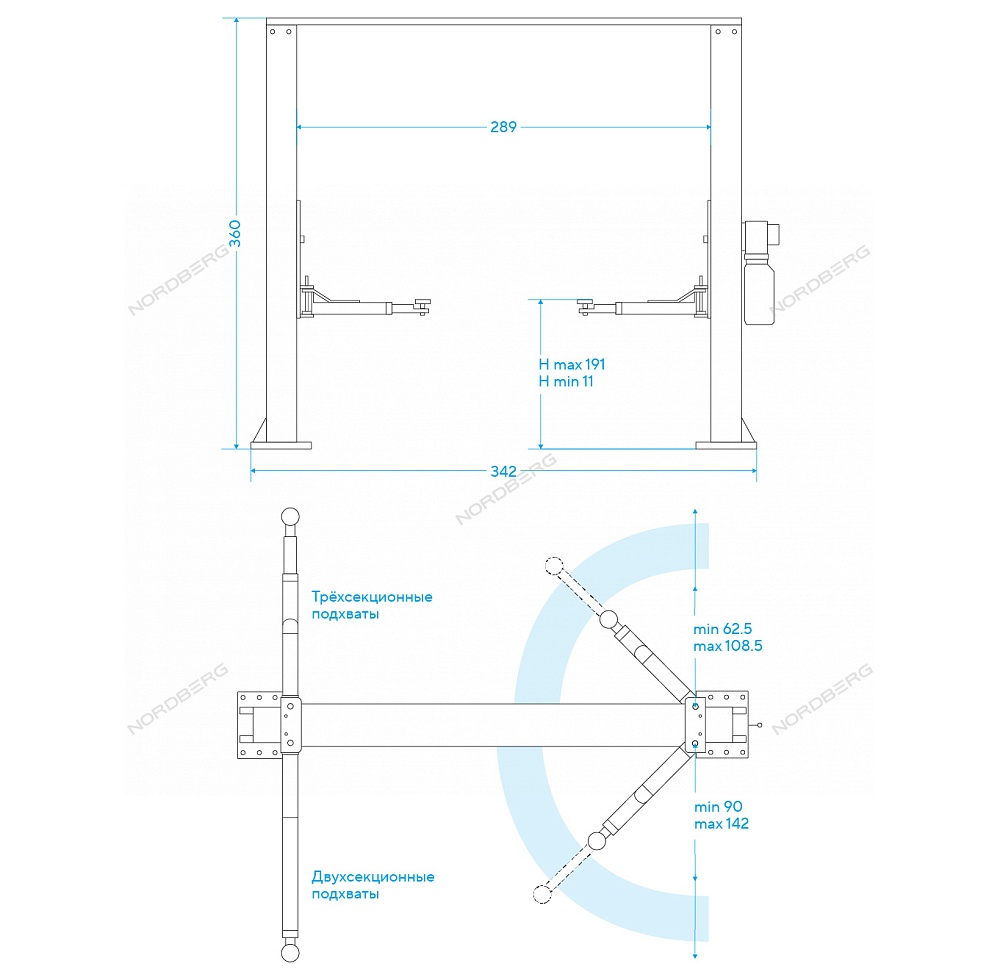 Подъемник двухстоечный 4 т, верхняя синхронизация, H=3,6 м, 220 В, серый NORDBERG N4120H-4G_3+2_220 купить в Воронеже цена ✅ - Все для СТО
