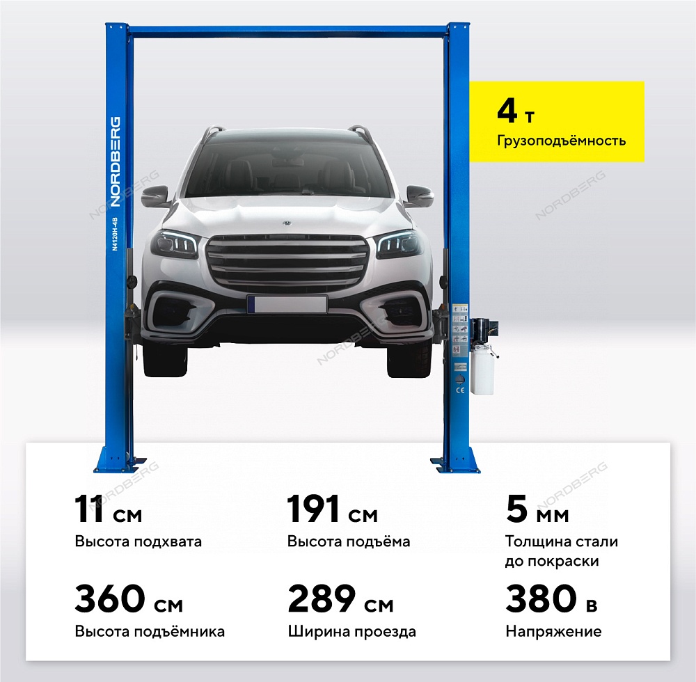 Подъемник двухстоечный 4 т, верхняя синхронизация, H=3,6 м, 220 В, синий NORDBERG N4120H-4B_3+2_220 купить в Воронеже цена ✅ - Все для СТО