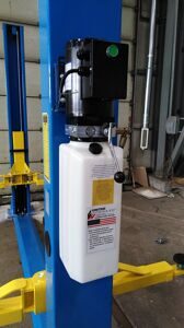 Двухстоечный электрогидравлический подъемник с верхней синхр, грузоподъемность 4.0 т, высота колонны 3621/3821мм, механическое управление стопорами на одной колонне.