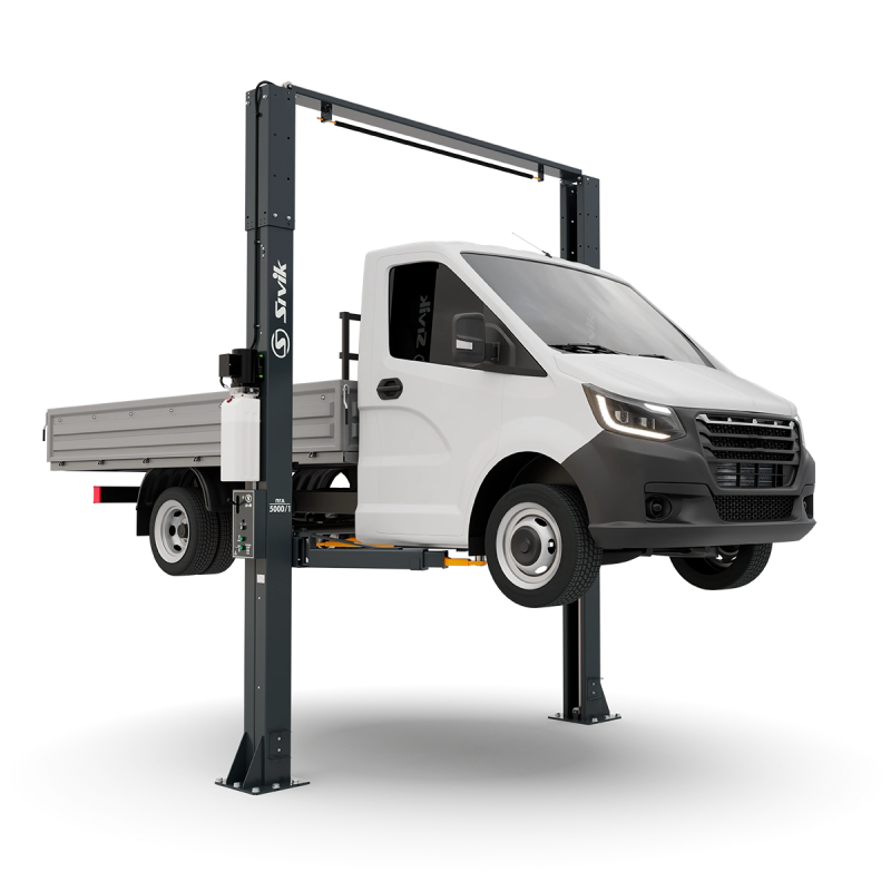 Двухстоечный электрогидравлический подъемник для легковых автомобилей, микроавтобусов, «джипов» и легких грузовиков типа «Газель» общей массой до 5 т. Верхняя синхронизация. Расположение стоек – симметричное. Электроуправление подъема и опускания.