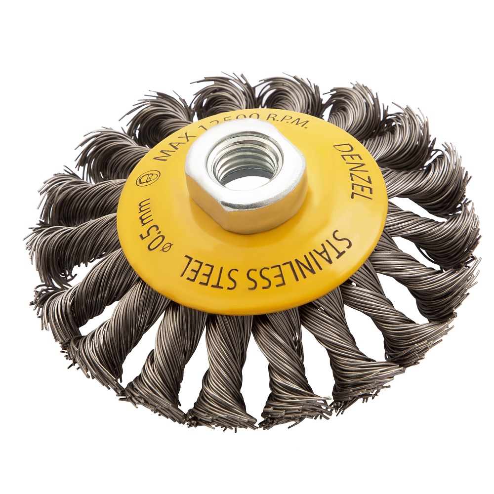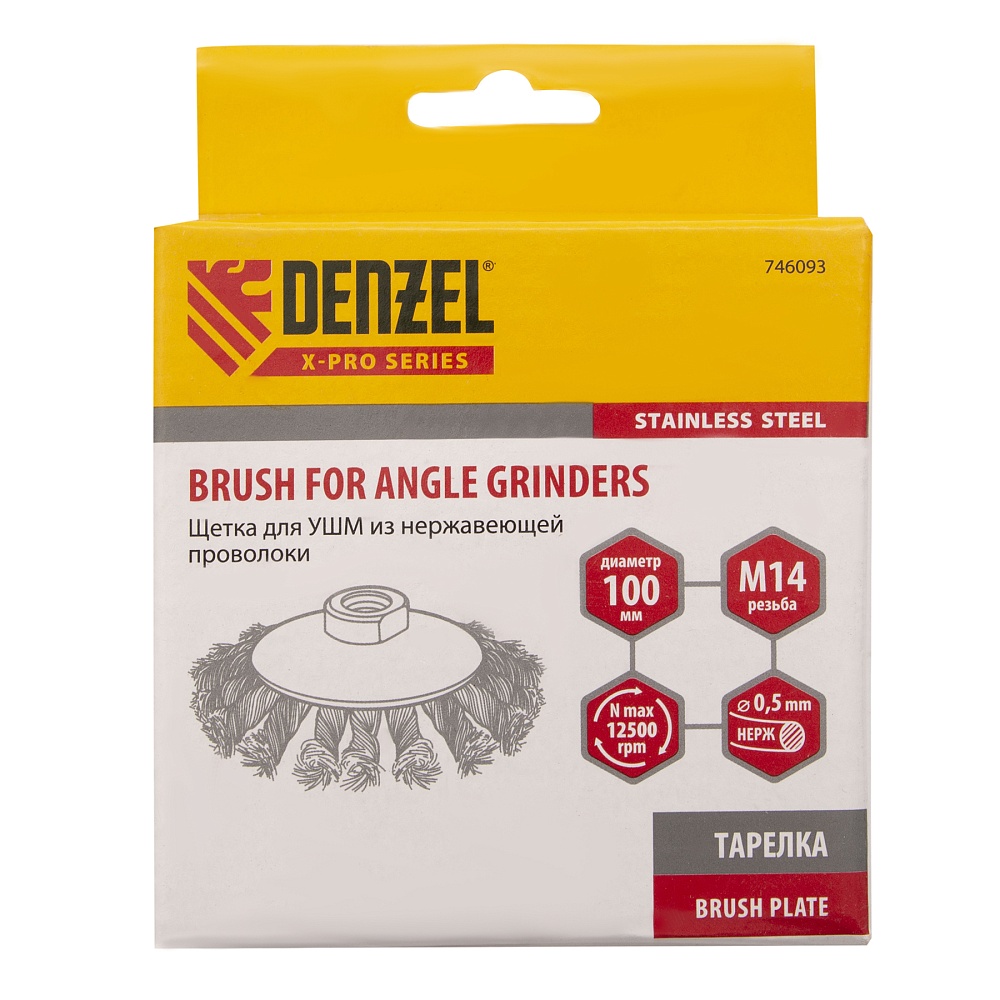 <p>Щетка для УШМ Denzel «Тарелка» 746093, 100 мм, М14, с щетиной из крученой нержавеющей проволоки 0,5 мм, предназначена для снятия толстого слоя краски, лака, ржавчины, для удаления заусенцев и окалины, зачистки сварных швов. Щеткой обрабатывают твердые, преимущественно металлические поверхности, в том числе из нержавеющей стали. Она удобна для очистки как плоских изделий, так и внутренних углов, пазов, изгибов. Щетка совместима с углошлифовальными машинами, поддерживающими работу на скорости до 12500 об/мин. Во время работы необходимо использовать средства индивидуальной защиты. Щетка пригодится во время строительства, на производстве, а также будет полезна в быту.</p><h2>Преимущества</h2><ul><li>Щетина изготовлена из нержавеющей стали AISI 201, поэтому ее частицы не вызывают микрокоррозии обрабатываемой поверхности.</li><li>Проволока имеет витую форму, что обеспечивает высокую деформационную стойкость щетины.</li><li>Щетина из нержавейки и покрытый эмалью корпус не подвержены коррозии, поэтому насадку можно использовать в условиях повышенной влажности.</li><li>Для крепления на вал УШМ предусмотрена гайка М14, что позволяет быстро устанавливать и заменять оснастку.</li><li>Корпус и гайка усилены, поэтому щетка устойчива к повышенным нагрузкам.</li><li>Щетка изготовлена под строгим технологическим контролем, что гарантирует ее высокое качество.</li></ul>