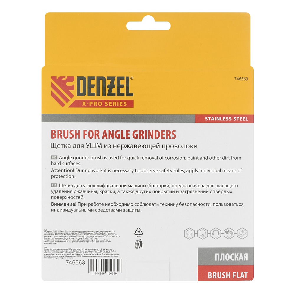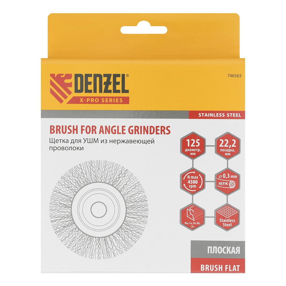 <p>Плоская щетка для УШМ Denzel 746563 диаметром 125 мм, с щетиной из витой нержавеющей проволоки 0,3 мм, с посадкой 22,2 мм, постепенно снимает тонкий слой материала, поэтому ее используют для щадящей обработки металлических, деревянных, пластиковых поверхностей, а также изделий из нержавеющей стали. Щетка удаляет ржавчину, загрязнения, остатки лакокрасочных покрытий из труднодоступных мест, пазов и углов. Оснастка с посадкой 22,2 мм устанавливается на фланец углошлифовальной машины, что удобно для длительной работы без смены насадок. Рекомендуемая максимальная скорость вращения составляет 4500 об/мин. Во время работы следует использовать средства индивидуальной защиты. Щетку применяют в строительстве, машиностроении, а также в быту.</p><h2>Преимущества</h2><ul><li>Щетина хорошо держит форму благодаря витой проволоке, устойчивой к деформациям при нагрузках.</li><li>Частицы щетины, оставшиеся на обработанной поверхности, не ржавеют, поскольку проволока изготовлена из нержавеющей стали AISI 201.</li><li>Щетка устойчива к коррозии даже в условиях повышенной влажности, т.к. ее корпус оцинкован, а щетина выполнена из нержавейки.</li><li>Оснастка обладает повышенной прочностью благодаря усиленному корпусу.</li><li>Высокое качество щетки подтверждено производителем, осуществляющим строгий технологический контроль на всех этапах производства.</li></ul>