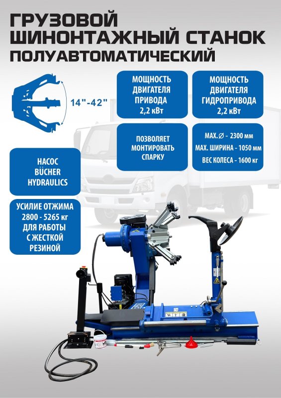 На станке установлены Моторы: Привод 2,2 кВт, + Гидронасос 2,2 кВт. В комплекте: Немецкий гидравлический насос- "Bucher Hydraulics". Грузовые шиномонтажные станки класса «премиум» для «жестких» условий эксплуатации. Диски алюминий и сталь диаметром 14”-42”, с адаптерами 14”-52”, Максимальное колесо 2300х1050 мм, вес до 1600 кг. Отжим min-max. 2800-5265Н/м. Идеально подходит для тракторов, сельхозтехники, дорожной техники.