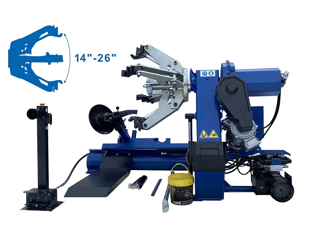 Станок шиномонтажный для колес грузовых автомобилей и автобусов, 4+3 кВт, 380 В, диаметр дисков 14-56", максимальный диаметр колеса 2500 мм (98"), ширина колеса до 1200 мм (47"), вес колеса до 2200 кг., универсальный 4-х кулачковый зажим, мобильная стойка управления. Может использоваться с камерными и бескамерными колесами.