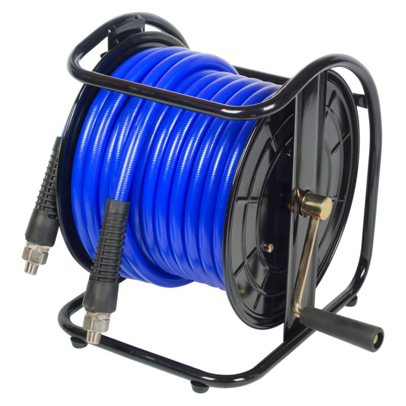 Шланг размещён на катушке, расположенной на специальной раме. Конструкция позволяет разместить шланг на рабочем месте так, как вам удобно, а по окончании работы свернуть шланг и перенести раму с катушкой на место хранения.