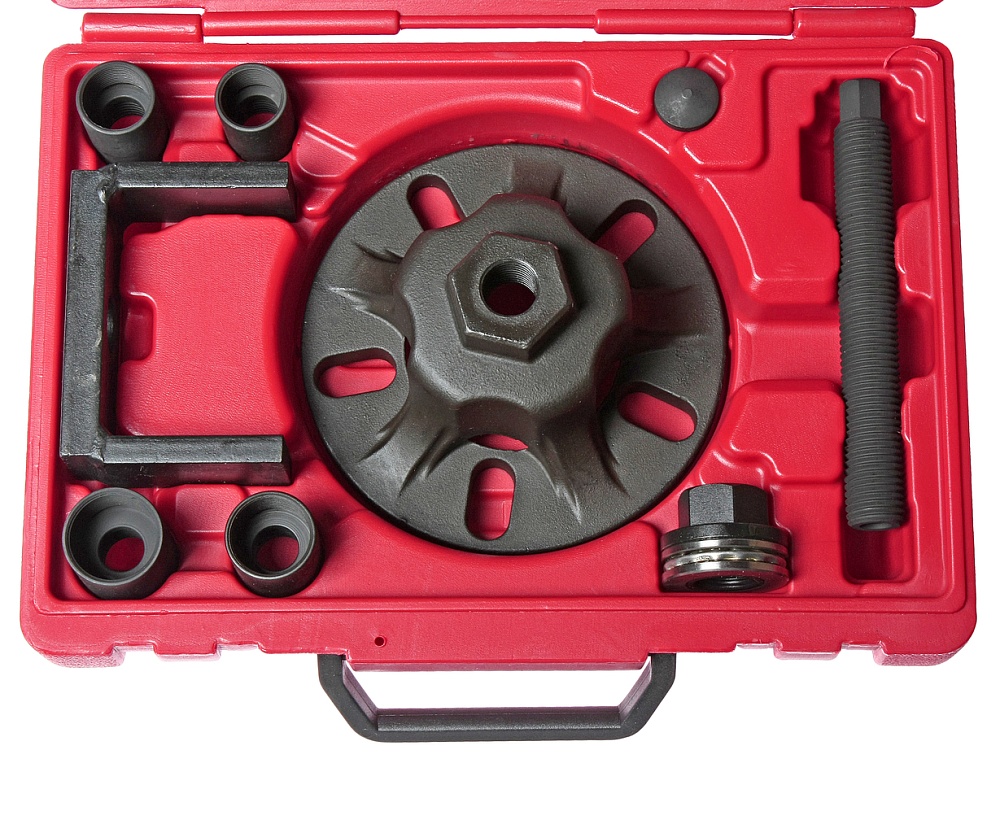 Способ применения: Зафиксируйте пластину в отверстиях колесного диска. Открутите болт, который фиксирует ступицу к приводном валу. Возьмите подходящий по размеру адаптер, затем зафиксируйте неподвижно приводной вал от коробки передач, приставьте рамку, зафиксируйте гайку и болт для дальнейшей работы по извлечению ступицы.