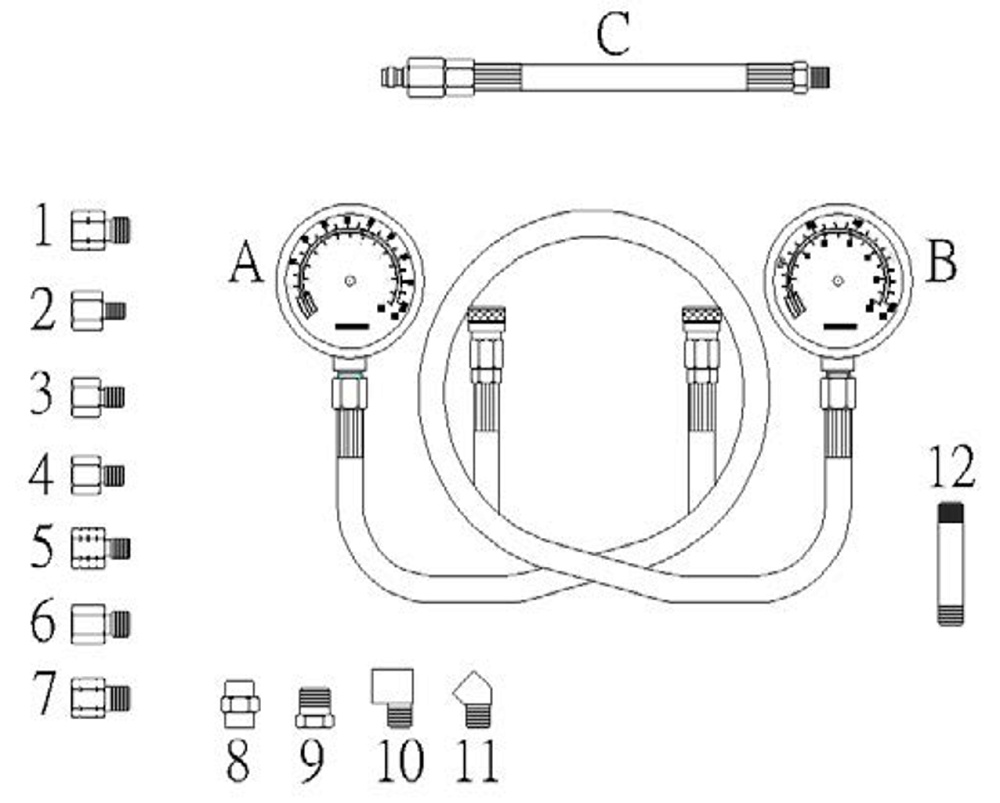 Большой ассортимент адаптеров и два манометра позволяют проводить тестирование для большинства КПП различных марок автомобилей.
